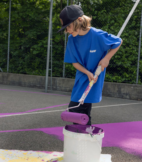 Das Endprodukt wurde Strich für Strich von den Schüler:Innen und jacques et brigitte mit Rollern und Pinsel aufgetragen, um den grauen Asphalt in eine bunte, einladende Fläche zu verwandeln.