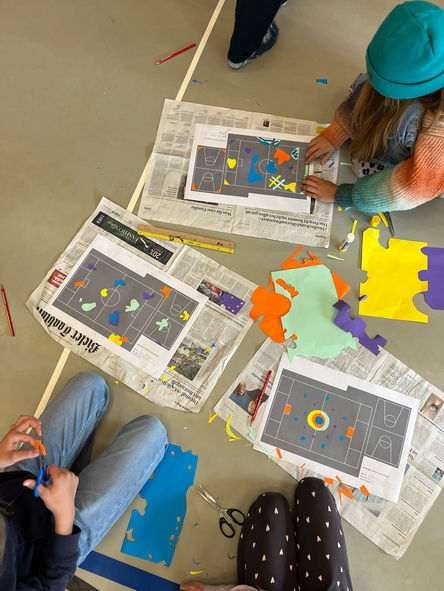 Tous les enfants de l'école, de la maternelle à la 6e année, ont pu réaliser la cour de récréation de leur choix dans le cadre d'un atelier. Divers éléments ont été prélevés parmi les 157 ébauches et nous les avons composés ensemble.
